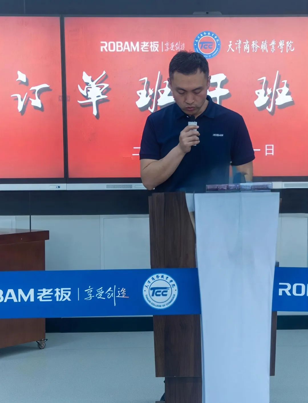 在国家全面推进职业教育改革、深化产教融合的战略指引下,天津商务职业学院以“服务区域经济、对接产业需求”为己任,积极探索校企协同育人新模式。4月11日,我校与天津众华老板实业有限公司(以下简称“老板电器”)联合举办的“直播订单班”正式开班,标志着双方在人才共育、资源共享、产教融合领域迈出坚实一步。校党委委员、副校长尹秀琴携营销学院领导班子,与老板电器领导团队共同见证订单班培训活动的开启。