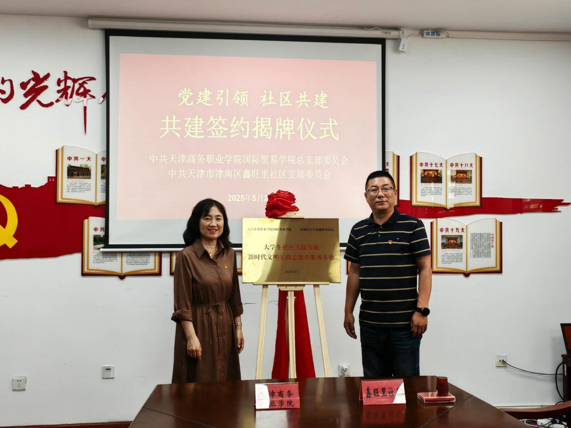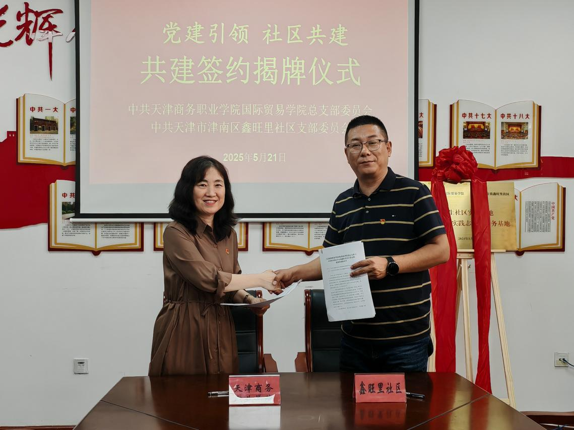 为深入推进党建引领工作,推动团员青年实践育人成效,2025年5月21日,中共天津商务职业学院国际贸易学院总支部委员会与中共天津市津南区鑫旺里社区支部委员会举行“党建引领 社区共建”签约揭牌仪式,国际贸易学院和鑫旺里社区相关人员出席本次活动。