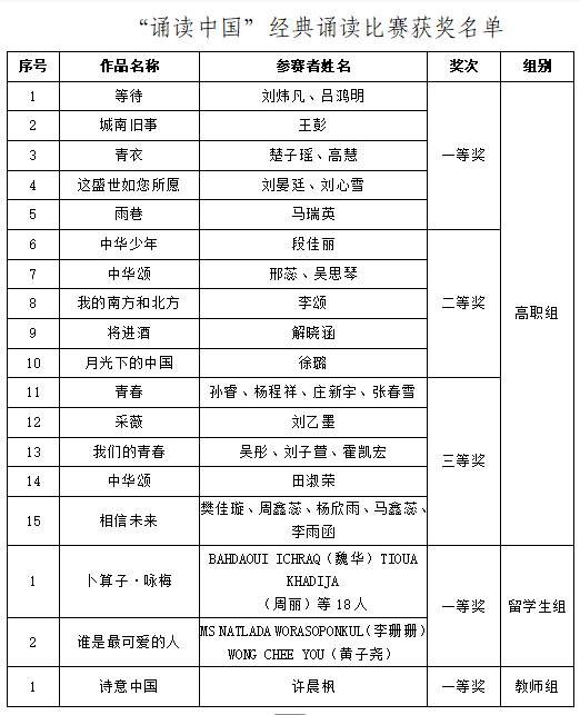为进一步提升参赛作品的水平,5月30日,学校特邀请了天津市“声动领诵团,经典诵读进校园”项目发起人、天津市教育科学院国家级普通话测试员叶红梅老师对“诵读中国”赛项一等奖作品从作品的诵读技巧、情感表达、舞台表现等方面进行了专业指导,让参赛选手们受益匪浅。根据作品质量和特色,最终从“诵读中国”赛项各赛道一等奖获奖作品中推选了高职组《等待》、教师组《诗意中国》、留学生组《卜算子・咏梅》三个作品参加相应赛项市赛比赛。“诗教中国”赛项则根据作品综合得分,推选前五名作品参加相应赛项市赛。根据相关文件要求,“印记中国”和“书写中国”参赛选手自行申报相应赛项的市赛和国赛,不做限额。