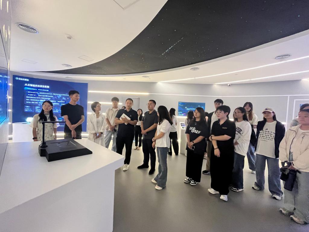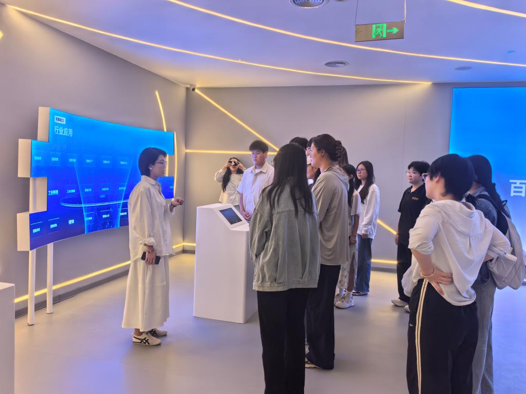 随后,在百度智能云千帆大模型创新基地,马克思主义学院教师结合实地见闻,为同学们带来一场以“聚焦新质生产力发展,读懂中国式现代化天津答卷”为主题的现场思政课,深入浅出地讲述天津科技创新前沿成就与高质量发展路径,鼓励同学们将专业所学与国家社会发展需求紧密结合,主动把握科技革命与产业变革的时代脉搏,让改革创新成为青春远航的不竭动力。师生间的互动交流热烈深入,同学们结合所见所闻分享思考,现场教学氛围浓厚。