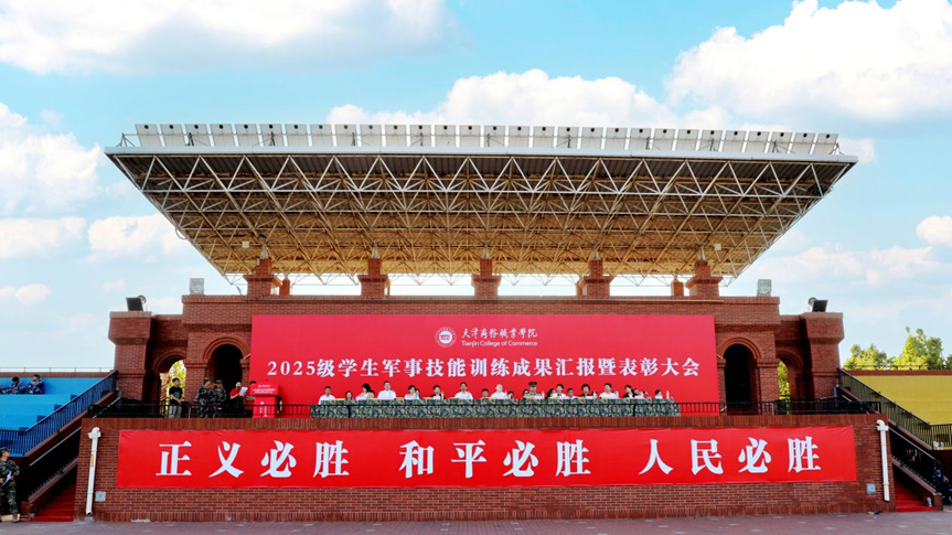 秋风劲爽,迷彩飞扬,学校体育场内军歌嘹亮、誓言铿锵,近日,天津商务职业学院举行了2025级学生军事技能训练成果汇报暨表彰大会。全体校领导、河西区人民武装部副部长李强、承训武警某部全体军训教官,学校相关部门负责人、师生代表共计3700余人共同见证了这一庄严时刻。
