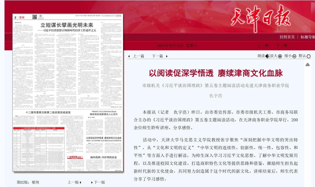 本报讯(记者 仇宇浩)昨日,由市委宣传部、市委市级机关工委、市商务局联合主办的《习近平谈治国理政》第五卷主题阅读活动,在天津商务职业学院举行,200余位师生聆听讲座、分享感悟。