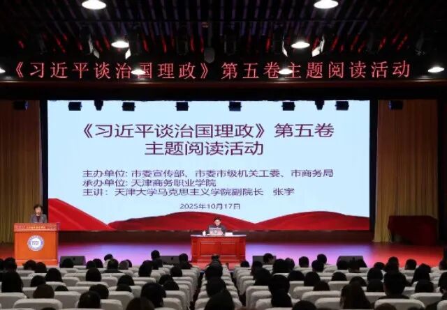 近日,由市委宣传部、市委市级机关工委、市商务局联合主办的《习近平谈治国理政》第五卷主题阅读活动,在天津商务职业学院举行,200余位师生聆听讲座、分享感悟。