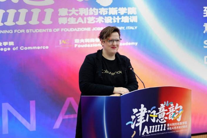 意大利约布斯学院国际部主任玛利亚・格拉齐亚・布拉蒂女士在发言中,向天津商务职业学院及为培训筹备付出辛勤劳动的全体工作人员致以诚挚感谢。她高度评价两校合作的高效性与务实性,希望参训学员不仅要学习 AI 艺术设计的相关技巧,更要学习如何让人工智能真正成为创作中的得力助手,祝愿学员们在交流中收获新知与技能,在体验中开阔眼界、感受多元文化、建立起深厚的跨国友谊。