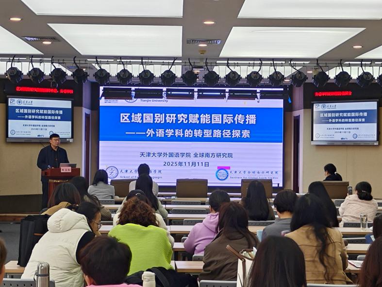 讲座特邀天津大学外国语学院院长王立松教授主讲。作为外国语言文学与跨文化传播领域的资深专家,王教授以生成式AI时代技术革新为切入点,深度剖析新时代外语学科面临的转型挑战与发展机遇,系统阐释区域国别学与外语学科交叉融合的内在逻辑。他结合天津大学区域国别学建设实践及全球南方研究院智库发展经验,为在场教师呈现了一场兼具理论深度与实践指导价值的学术分享。