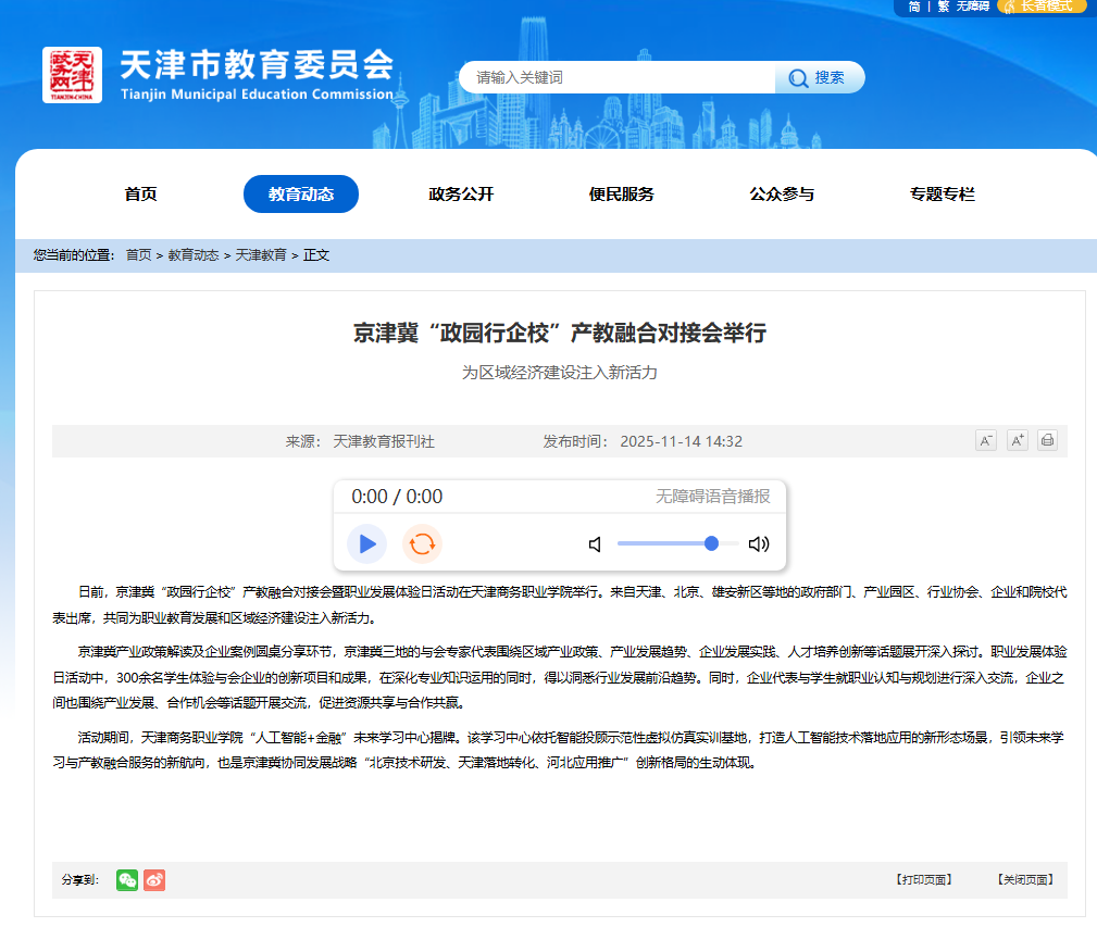 日前,京津冀“政园行企校”产教融合对接会暨职业发展体验日活动在天津商务职业学院举行。来自天津、北京、雄安新区等地的政府部门、产业园区、行业协会、企业和院校代表出席,共同为职业教育发展和区域经济建设注入新活力。