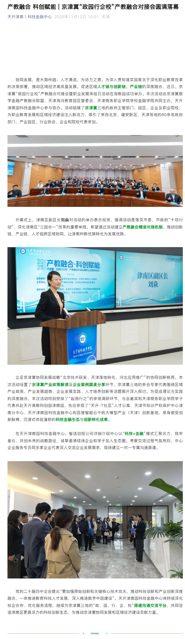 媒体关注 |【天开津南 | 科技金融中心】 产教融合 科创赋能 | 京津冀“政园行企校”产教融合对接会圆满落幕