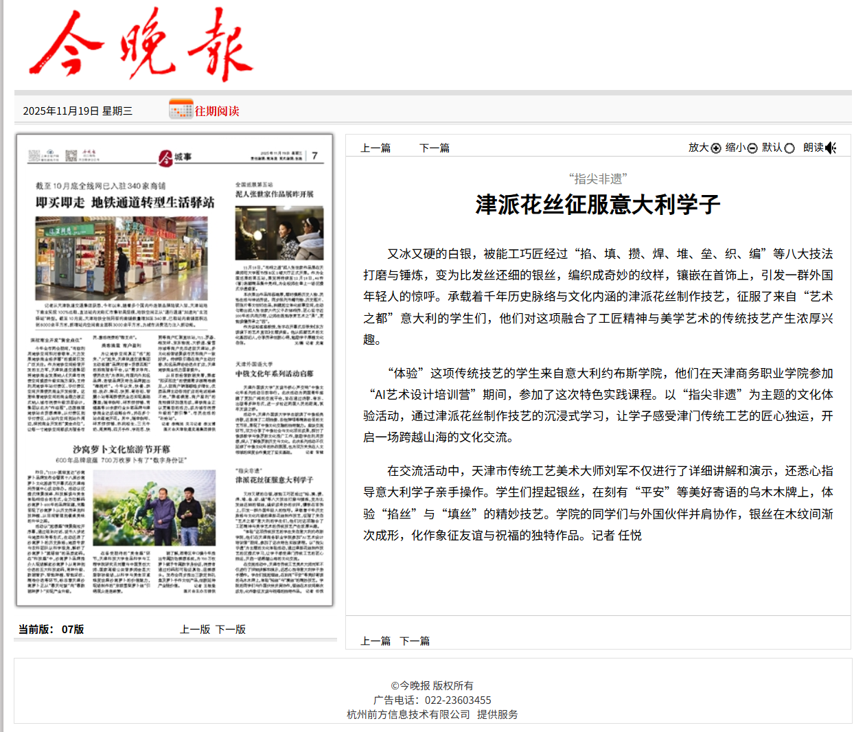 “体验”这项传统技艺的学生来自意大利约布斯学院,他们在天津商务职业学院参加“AI艺术设计培训营”期间,参加了这次特色实践课程。以“指尖非遗”为主题的文化体验活动,通过津派花丝制作技艺的沉浸式学习,让学子感受津门传统工艺的匠心独运,开启一场跨越山海的文化交流。
