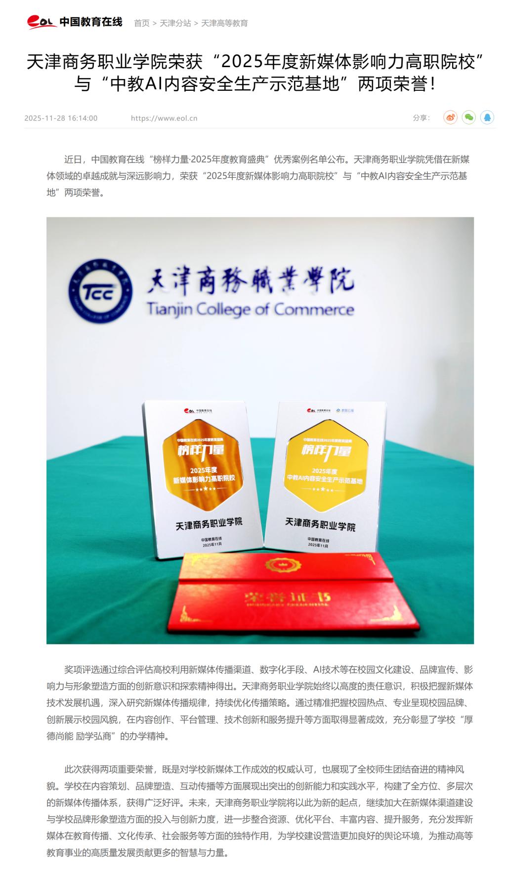 媒体关注 |【中国教育在线】天津商务职业学院荣获“2025年度新媒体影响力高职院校”与“中教AI内容安全生产示范基地”两项荣誉!