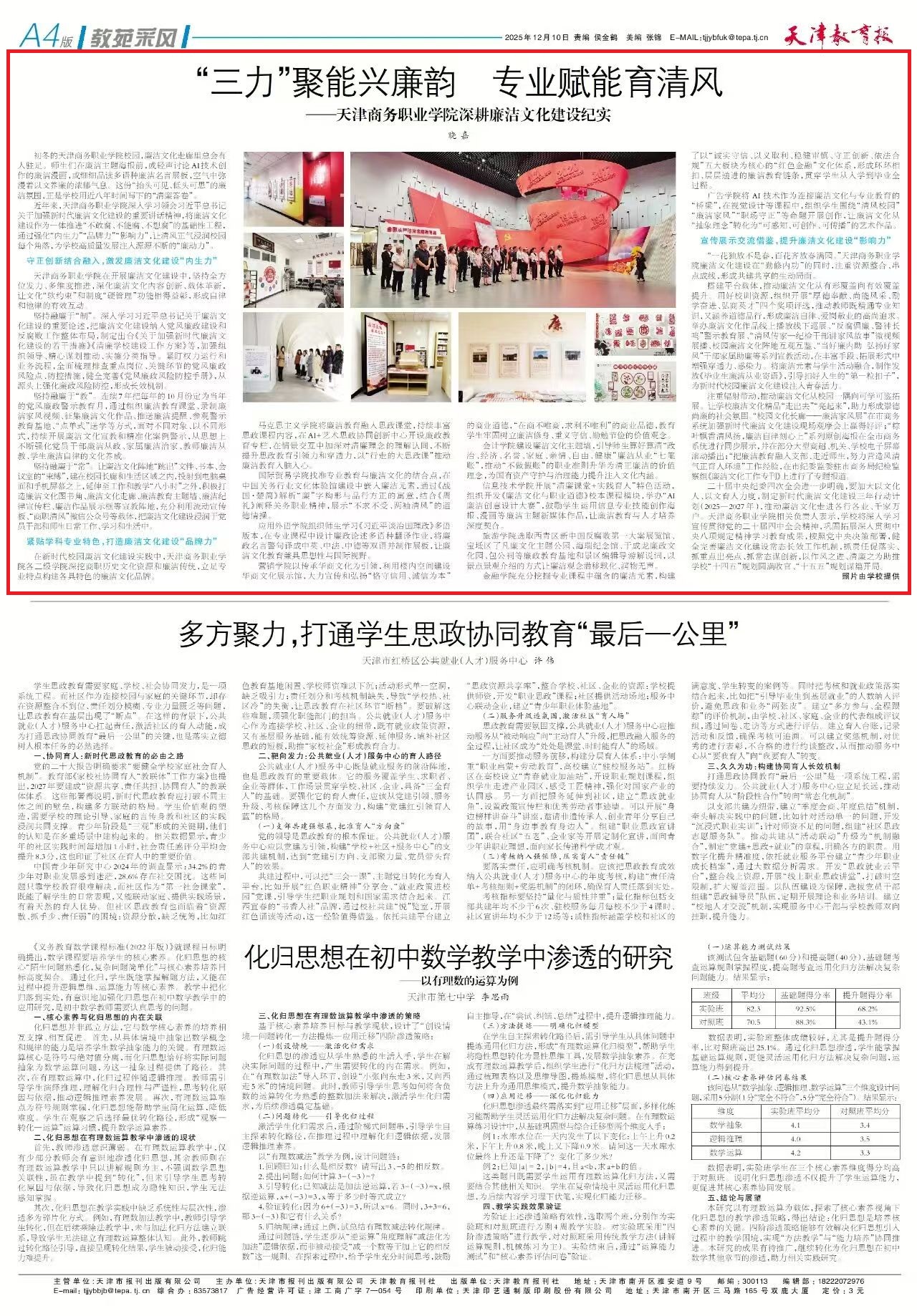 近年来,天津商务职业学院深入学习领会习近平总书记关于加强新时代廉洁文化建设的重要讲话精神,将廉洁文化建设作为一体推进“不敢腐、不能腐、不想腐”的基础性工程,通过强化“内生力”“品牌力”“影响力”,让清风正气浸润校园每个角落,为学校高质量发展注入源源不断的“廉动力”。