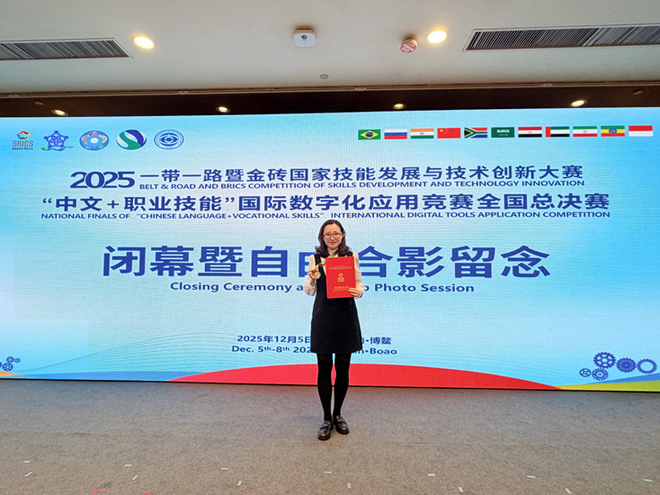 2025年12月8日,为期三天的2025“一带一路”暨金砖国家技能发展与技术创新大赛之“中文+职业技能”国际数字化应用竞赛赛项全国总决赛在海南博鳌亚洲教育国际会议中心落下帷幕。本次全国总决赛由教育部中文人文交流中心、金砖国家工商理事会中方理事会、“一带一路”暨金砖国家技能发展国际联盟等权威机构联合主办,是“金砖大赛”框架下聚焦“中文+职业技能”数字化融合应用的高水平国际赛事,吸引了来自全国各地的500多名师生参加比赛。学校公共外语教学部教师张晓嘉不畏强手,奋力拼搏,在众多高水平选手中脱颖而出,勇夺大赛银牌(二等奖)。