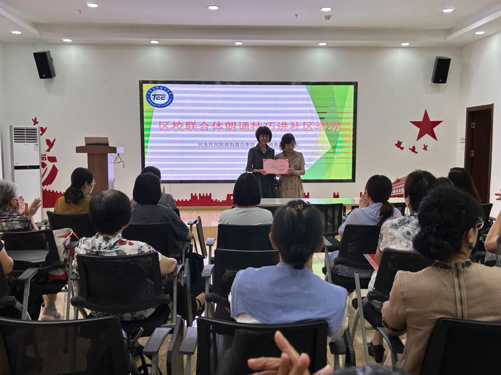 经国务院批准,自1998年起,每年9月第三周为全国推广普通话宣传周(简称推普周)。今年推普周是第26届,主题为“推广普通话 奋进新征程”。为配合推普周活动,进一步提高社区居民普通话水平,强化社区居民的语言规范意识,9月13日,我校普通话测试站联合河东区向阳楼街道办事处开展了“推广普通话 奋进新征程”的诵读经典活动,号召广大居民学好普通话、说好普通话,用好普通话,让居民在诵读中陶冶情操,凝聚智慧,提升素养。
