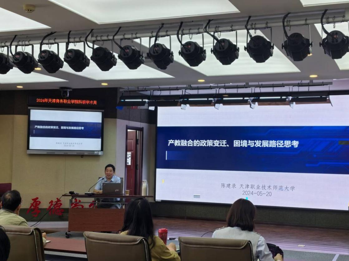 为进一步对标国内一流职业院校科研发展水平,营造良好的学术氛围,切实提高广大教师的科研素养,培养中青年教师的科研能力,落实学校“十四五”重点工作目标,有效践行“四个善作善成”重要要求。日前,营销学院、会计学院联合举办了学校科研学术周交流活动。活动聘请天津职业技术师范大学教育学院陈建录教授,为全体专任教师开展了一场以“产教融合的政策变迁、困境与发展路径思考”为主题的科研学术讲座。